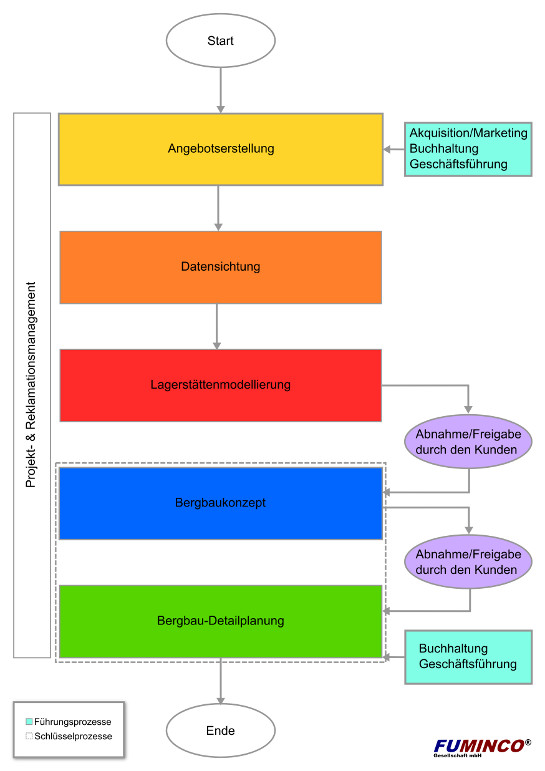 Auf Basis der langjährigen Bergbauplanungserfahrung unserer Mitarbeiter und mit Unterstützung der Technischen Fachhochschule Georg Agricola zu Bochum konnten wir eine DIN 9001 konforme Prozesslandschaft für unsere Bergbauplanungsleistungen aufbauen. Anhand der fünf (Haupt-)Prozesse, von der Angebotserstellung bis zur Bergbau-Detailplanung, können wir in Verbindung mit den dazugehörigen Teilprozessen und Prozessbeschreibungen unsere Leistung im Sinne des Kunden kontinuierlich verbessern. Zudem erlaubt uns diese Dokumentation unserer Leistungen, unseren Kunden eine große Anzahl an Hilfsmitteln und Dokumenten für ihre eigene Planung sowie für die Projektsteuerung zur Verfügung zu stellen.