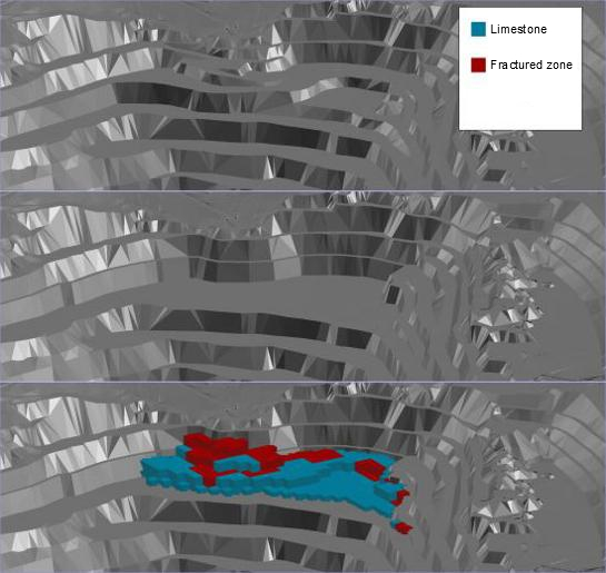 In order to be able to display a detailed map of the deposit, a so called block model is created based on the drill hole database and the 3-D profile data. The big advantage of a block model is that the deposit body is fragmented into geometrical entities, which allows for cutting or delimiting of the deposit body for different planning stages and thus for exact calculations of volumes.