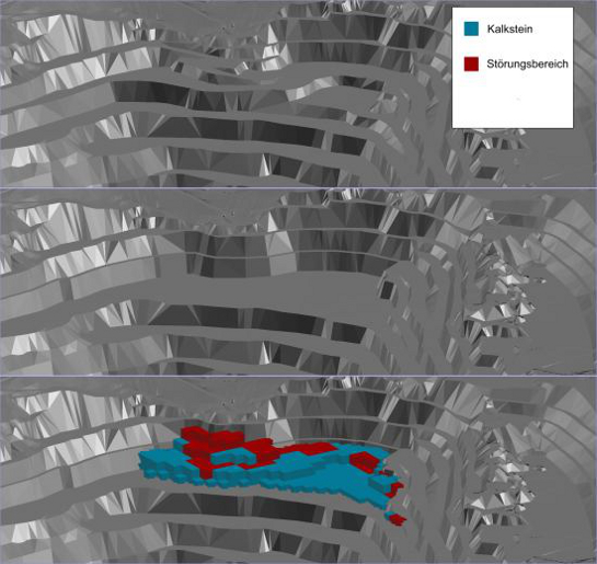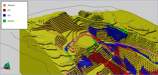 Das geologische Blockmodell der Lagerstätte, das uns zur Verfügung gestellt wurde, wies neben Abraum auch drei Sorten von Eisenerz aus. Außer den zwei Haupt-Eisenerzsorten existiert in dieser Lagerstätte auch eine Arm-Eisenerzsorte. Bei der Tagebauplanung musste somit nicht nur das vorgegebene Verhältnis zwischen Erz- und Abraumförderung beachtet, sondern darüber hinaus auch ein bestimmtes Verhältnis zwischen den drei Erzsorten untereinander eingehalten werden. Diese Parameter wurden durch die nachgeschalteten Aufbereitungsanlagen in dem wasserarmen Gebiet vorgegeben.